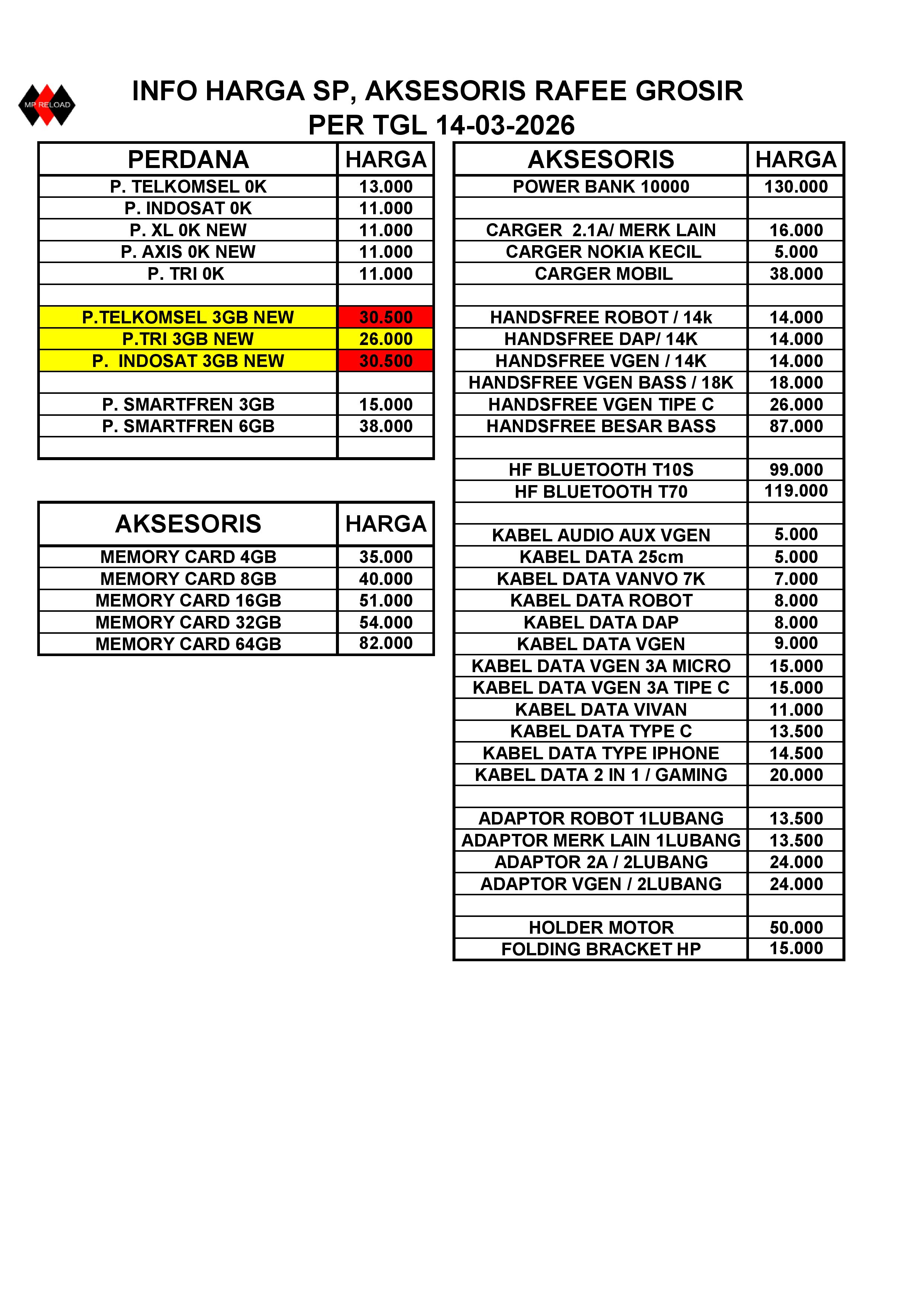 HARGA PERDANA DAN AKSESORIS PER TGL 14-03-2026